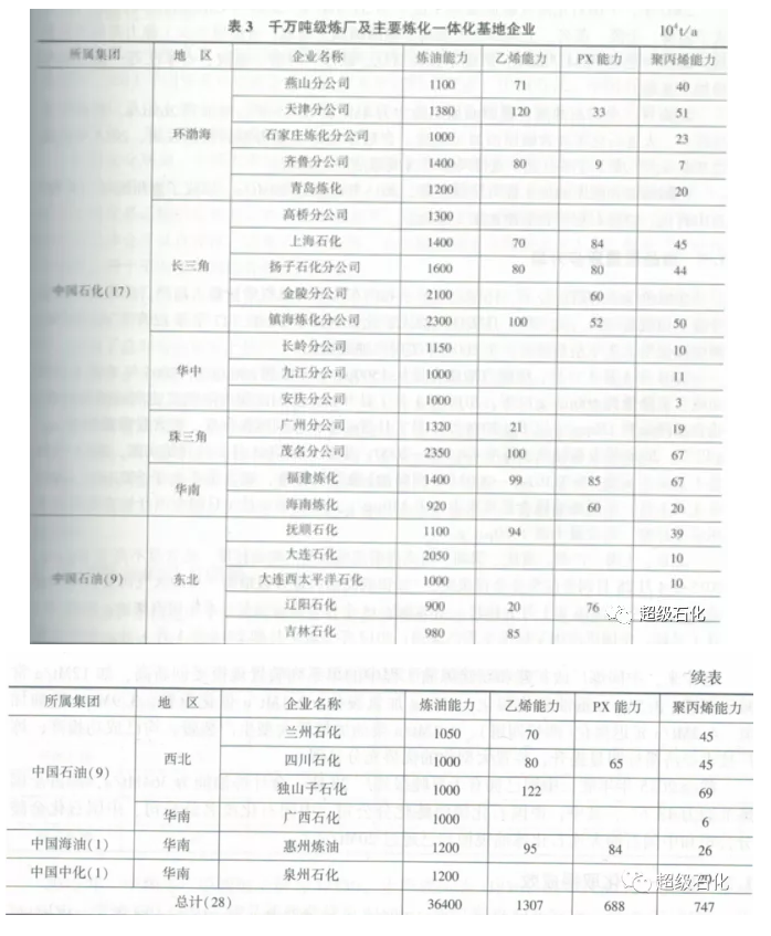 官芳則芳”的煉油理念,使寶貴的石油資源得到合理優(yōu)化利用同時(shí),集中綜合利用煉廠和石化裝置的各種產(chǎn)品和中間產(chǎn)物,方便原料和產(chǎn)品的集中進(jìn)出,提升設(shè)施共享水平,減少水、電、汽、熱、風(fēng)等公用工程系統(tǒng)的投資和費(fèi)用,提高經(jīng)濟(jì)效益。中國煉油工業(yè)依托萬噸級(jí)大型煉廠的建設(shè),結(jié)合大型乙烯工程的新建或改擴(kuò)建,已經(jīng)形成了一批大型煉化一體化基地企業(yè),明顯提升煉油業(yè)務(wù)的競(jìng)爭(zhēng)力、如表3所示。
